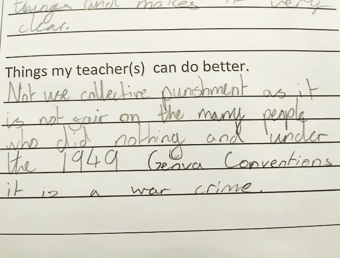 Vía redes sociales me llegó este artículo donde una niña en Reino Unido, Ava Morrison-Bell de 11 años de edad, tuvo una inteligente respuesta cuando le impusieron un castigo grupal, al final en una nota para el profesor preguntan que que podría hacer el profesor la próxima vez.